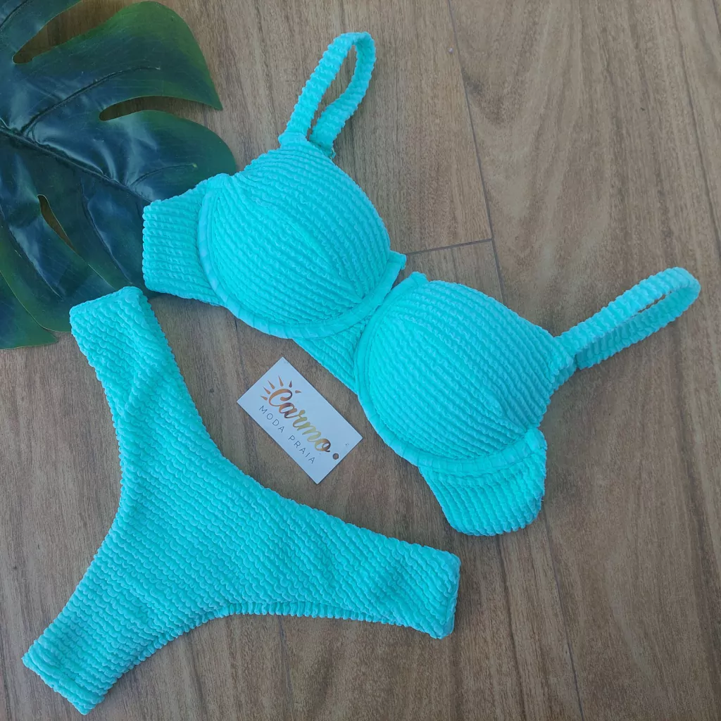 Conjunto meia taça tecido texturizado verde tiffany com bojo removível, alças de regular e aro para dar sustentação calcinha asa delta fio duplo.